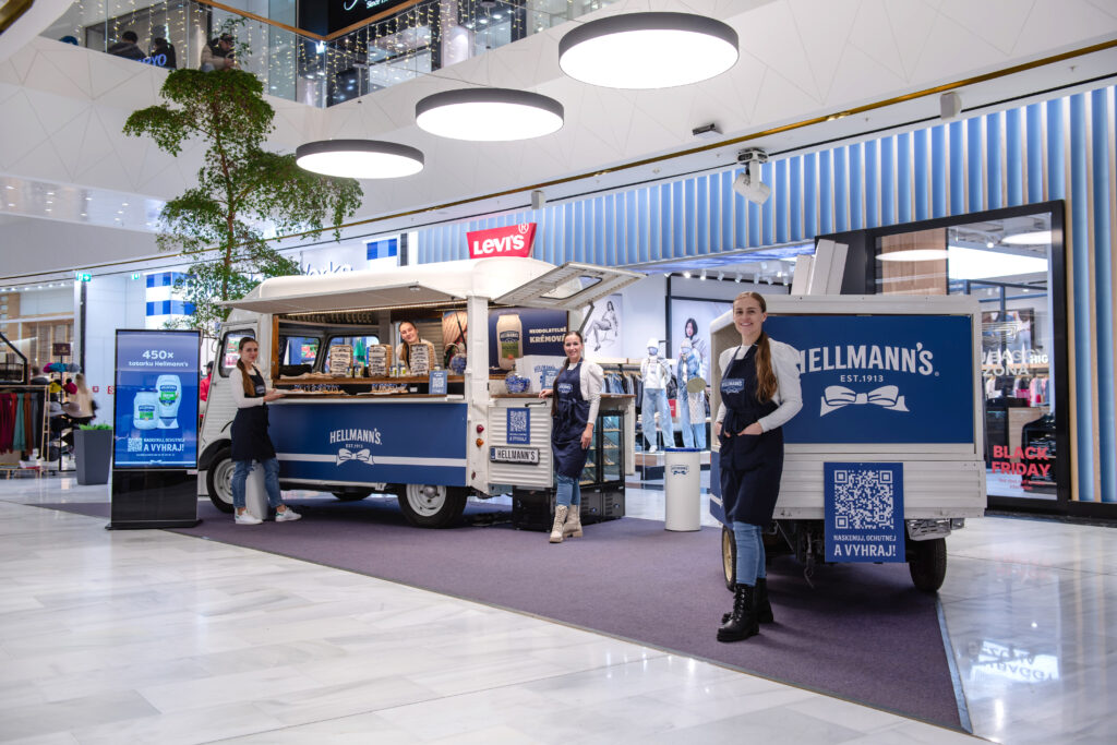 Pop-up aktivace značky Hellmann’s ve Westfield Chodov během Black Friday víkendu propojila ochutnávku čerstvě připravovaných sendvičů s digitální soutěží přímo v místě vysoké návštěvnosti. Cílem bylo představit tatarskou omáčku Hellmann’s jako chutnou a vyváženou součást jednoduchých sendvičových receptů. Návštěvníci se zapojovali prostřednictvím QR kódu umístěného na foodtrucku a Piaggio tříkolce a mohli vyhrát brandovaný Hellmann’s merch včetně elektronické kuchařky s recepty. Aktivace dosáhla engagement rate 33 % a zaznamenala 270 000 zhlédnutí během jediného dne. Výsledkem byla hravá, vysoce viditelná instalace, která přirozeně vtahovala spotřebitele do interakce se značkou a podpořila její vnímání v místě prodeje.